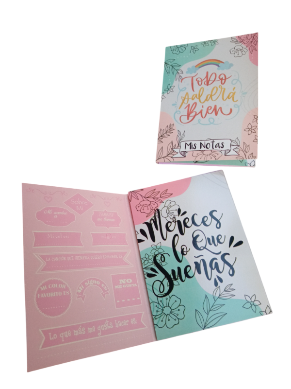 Agenda de tapa semi dura. Con frases motivacionales. Dentro trae un block para anotar lo que quieras. Es muy hermosa!!!