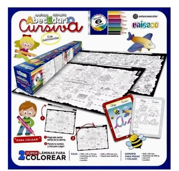 Incluye dos laminas para pintar de 645 mm x 475 mm y 6 lápices de colores